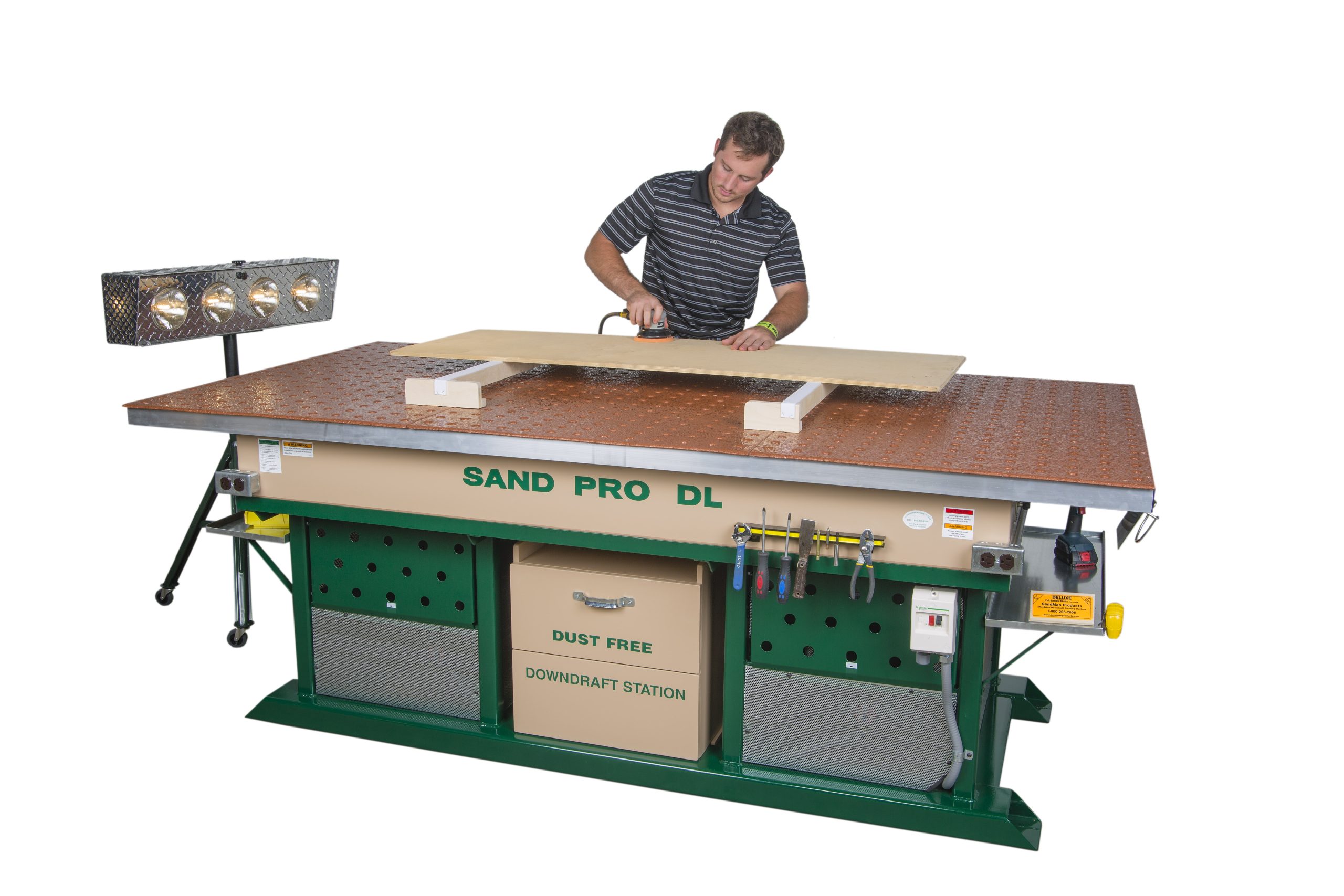 The Sand Pro DL9648 is a dedicated 8′ X 4′ sanding station that doubles as a workbench. A large and versatile sanding table with many user friendly features.