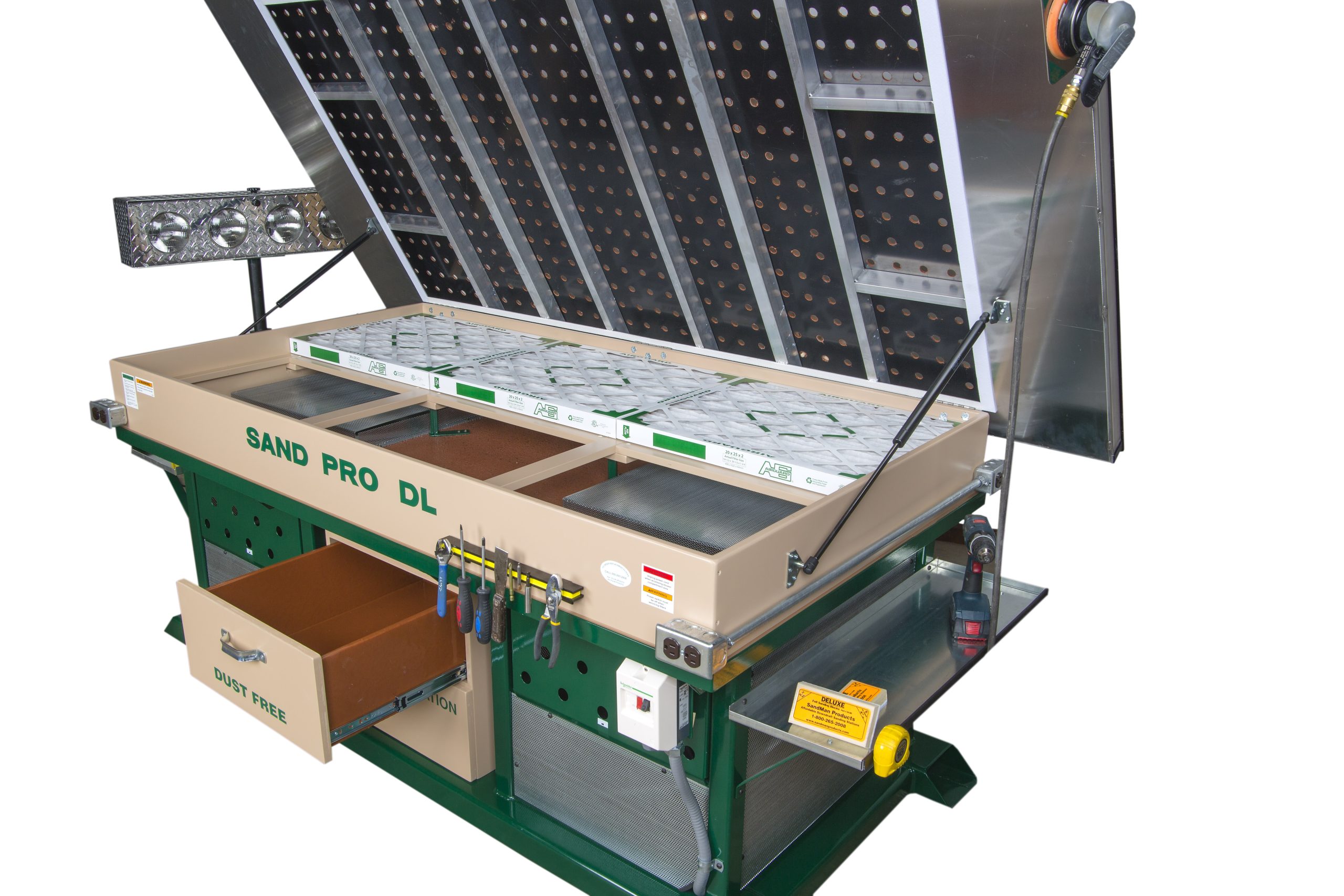 The Sand Pro DL9648 is a dedicated 8′ X 4′ sanding station that doubles as a workbench. A large and versatile sanding table with many user friendly features including (4) duplex receptacles, a grid system top, (2) 10″ X 32″ shelves, (2) 18″ X 24″ storage drawers, has easy filtering service, and uses (2) 1.5 HP motors. This machine is great for sanding large items or to use as a multi-person station.